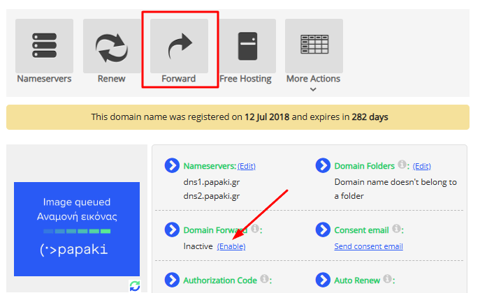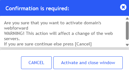 5. By clicking Activate Forward, you will be asked to confirm before proceeding, as this action will insert Papaki’s DNS Nameservers. If you had already set custom Nameservers, this action will overwrite them and disconnect the previous configuration.