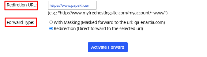 The With Masking option forwards to the target address while keeping your domain in the URL. The Redirection option directly redirects to the target address.