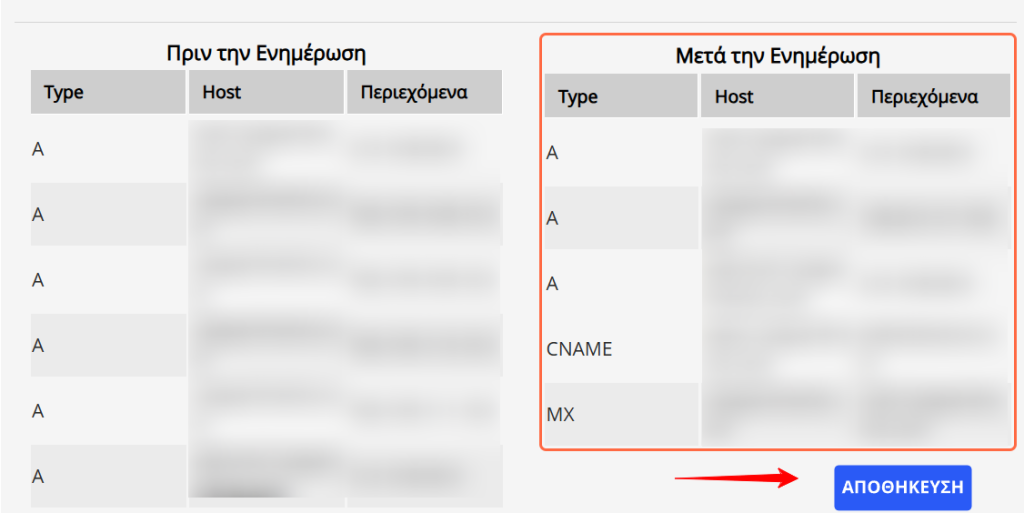 δ) Θα εμφανιστούν οι dns εγγραφές που θα εισαχθούν και επιλέγετε Αποθήκευση.