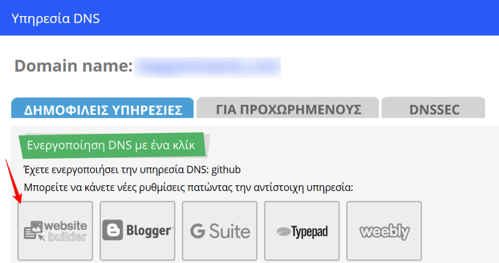 γ) Στο πεδίο Υπηρεσία DNS επιλέγετε Επεξεργασία και από τις Δημοφιλείς Υπηρεσίες κάνετε click στο Website Builder.